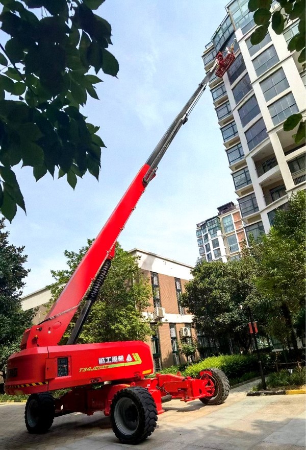 10月初,南宫NG·28重机T34JE高空作业平台出现在洛阳某小区,参与翻新改造项目建设。正值国庆月,T34JE的大红机身与周围环境相得益彰,成为小区一道亮丽的风景。